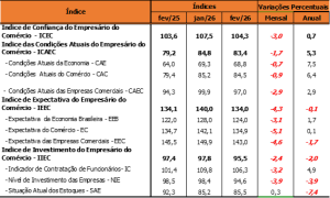 Cabe destacar que o ambiente do consumidor segue relativamente favorável, com melhora nas condições de renda e manutenção do emprego, o que tem sustentado o consumo no comércio e nos serviços. Ainda assim, esse cenário não tem sido suficiente para elevar a confiança do empresário na mesma proporção. Isso se explica pelos desafios enfrentados no dia a dia, como juros elevados, incertezas tributárias, dificuldades na contratação de mão de obra, além de problemas recorrentes como furtos, entre outros, e que minam a confiança.
