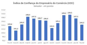 O Índice de Confiança do Empresário do Comércio (ICEC), apurado mensalmente pela Fecomércio BA, registrou nova queda, de 3% em relação a janeiro, retornando aos 104,3 pontos, após ter alcançado 107,5 pontos no mês anterior. Na comparação anual, entretanto, observa-se leve avanço de 0,7%.