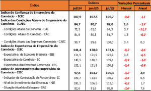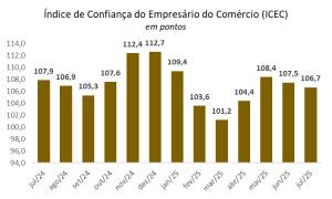 O Índice de Confiança do Empresário do Comércio (ICEC), elaborado mensalmente pela Fecomércio-BA, apresentou nova retração em julho, ao atingir 106,7 pontos — uma leve queda de 0,8% em relação a junho e de 1,1% na comparação anual, quando o indicador marcava 107,9 pontos.