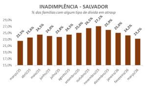 A taxa de famílias endividadas registrou o primeiro recuo após dez altas consecutivas, passando de 76,8% para 75,9% entre fevereiro e março. Apesar da queda, o indicador permanece próximo do recorde histórico, pouco acima dos 80% observados no início da série, em 2010. Atualmente, são 773 mil lares em Salvador com algum tipo de dívida.