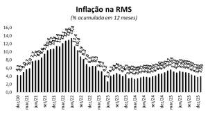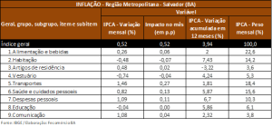 A inflação na Região Metropolitana de Salvador, medida pelo Índice de Preços ao Consumidor Amplo (IPCA) do IBGE, inicia o ano de 2026 com variação de 0,52%, muito próxima à observada em dezembro, de 0,59%. No acumulado de 12 meses, o índice chega a 3,94%, mantendo-se pelo segundo mês consecutivo abaixo da casa dos 4%.