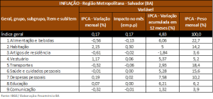 Os dados da inflação de setembro na região metropolitana de Salvador vieram bastante positivos. Segundo divulgação do IBGE, os preços de produtos e serviços registraram um avanço médio de 0,17% e acumulam 4,83% nos últimos 12 meses. Embora a variação tenha sido superior à do mês anterior, de -0,08%, o cenário ainda é de baixa pressão sobre os preços.