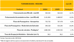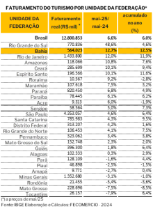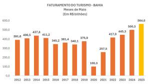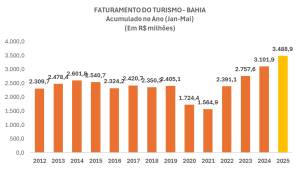 No mês de maio, o turismo do estado da Bahia faturou R$ 564 milhões, um crescimento de 12,7% em relação ao mesmo período do ano passado, representando mais uma vez um recorde histórico para o mês. Ainda de acordo com o levantamento mensal da Fecomércio BA, em parceria técnica com a FecomercioSP, o acumulado do ano já soma R$ 3,5 bilhões — também o mais elevado da série histórica —, com um aumento de 12,5% na comparação anual, o que representa um acréscimo absoluto de quase R$ 400 milhões no período.